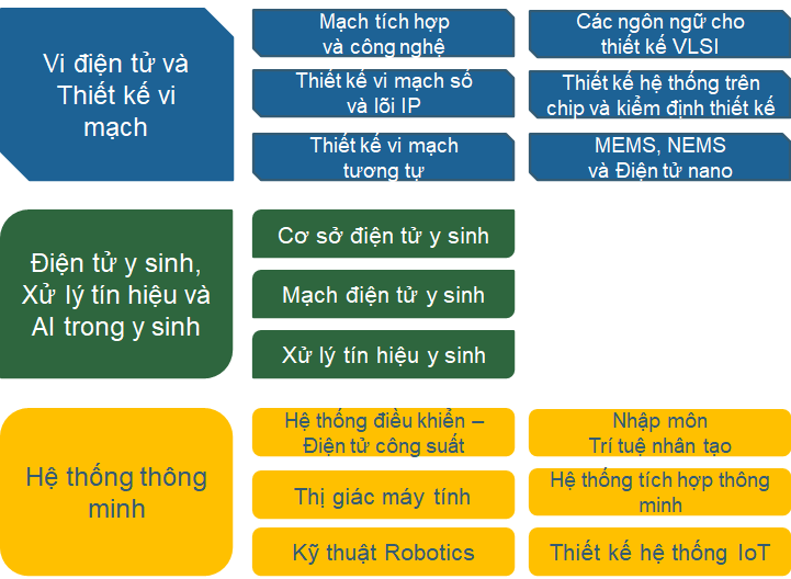 • Thiết kế vi mạch (thiết kế vi mạch số, vi mạch tương tự), thiết kế hệ thống trên chip (SoC), vi điện tử và thiết bị MEMS-NEMS