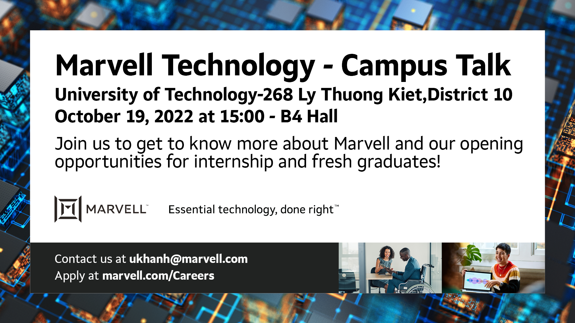 Sắp tới đây Công ty Marvell có tổ chức buổi hội thảo giới thiệu về công ty và các vị trí tuyển dụng dành cho sinh viên, cũng như các vị trí dành cho sinh viên sắp tốt nghiệp. Xin mời các bạn sinh viên quan tâm đăng kí theo đường link bên dưới.
