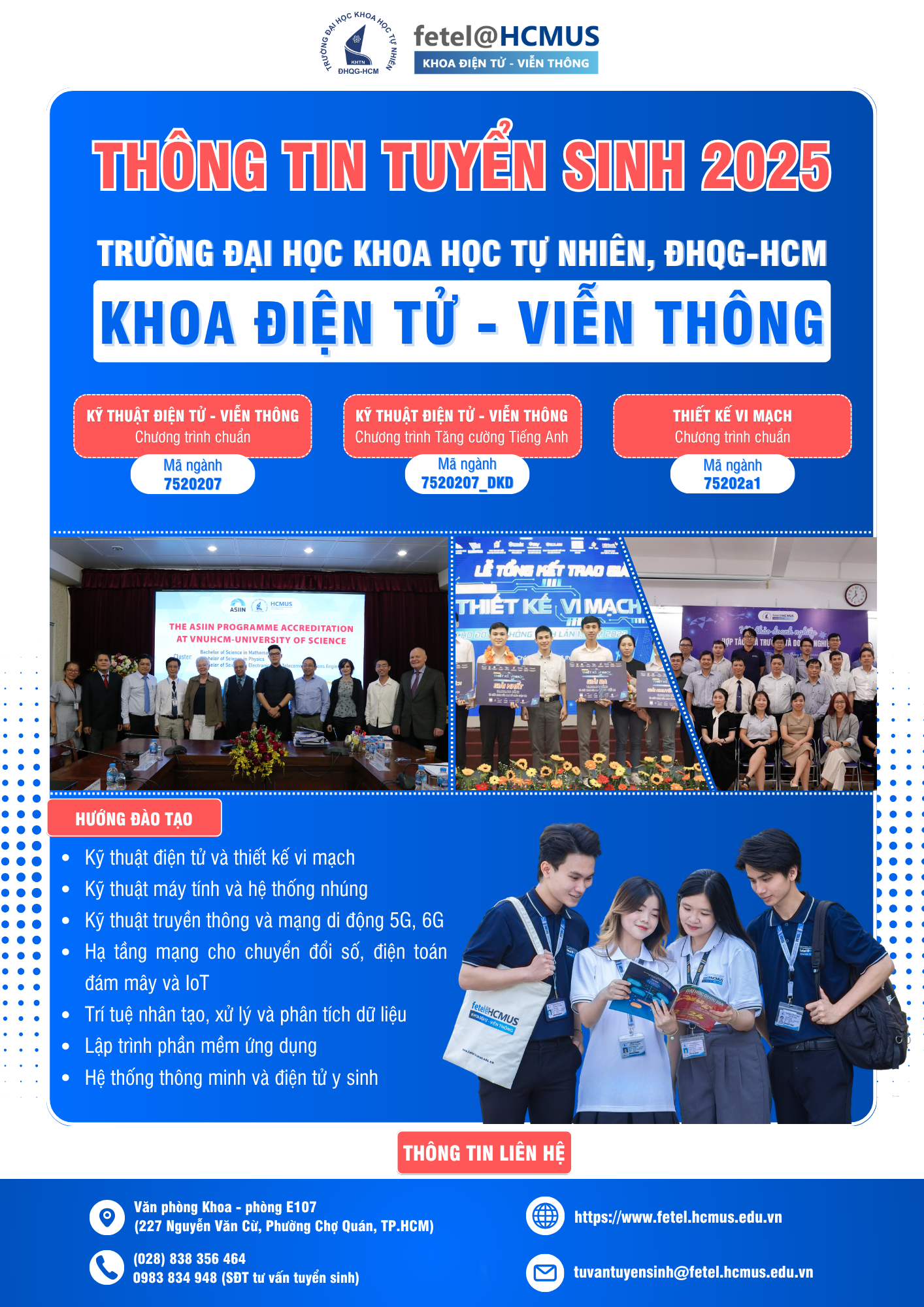 7520207 | Kỹ thuật điện tử – viễn thông (CT Chuẩn) | 140 | (1) A00: Toán – Vật lý – Hóa học (2) A01: Toán – Vật lý – Tiếng Anh (3) A02: Toán – Vật lý – Sinh học (4) C01: Toán – Vật lý – Ngữ văn (5) X06: Toán – Vật lý – Tin học (6) X07: Toán – Vật lý – CN công nghiệp (7) X26: Toán – Tin học – Tiếng Anh (8) X27: Toán – CN công nghiệp – Tiếng Anh |